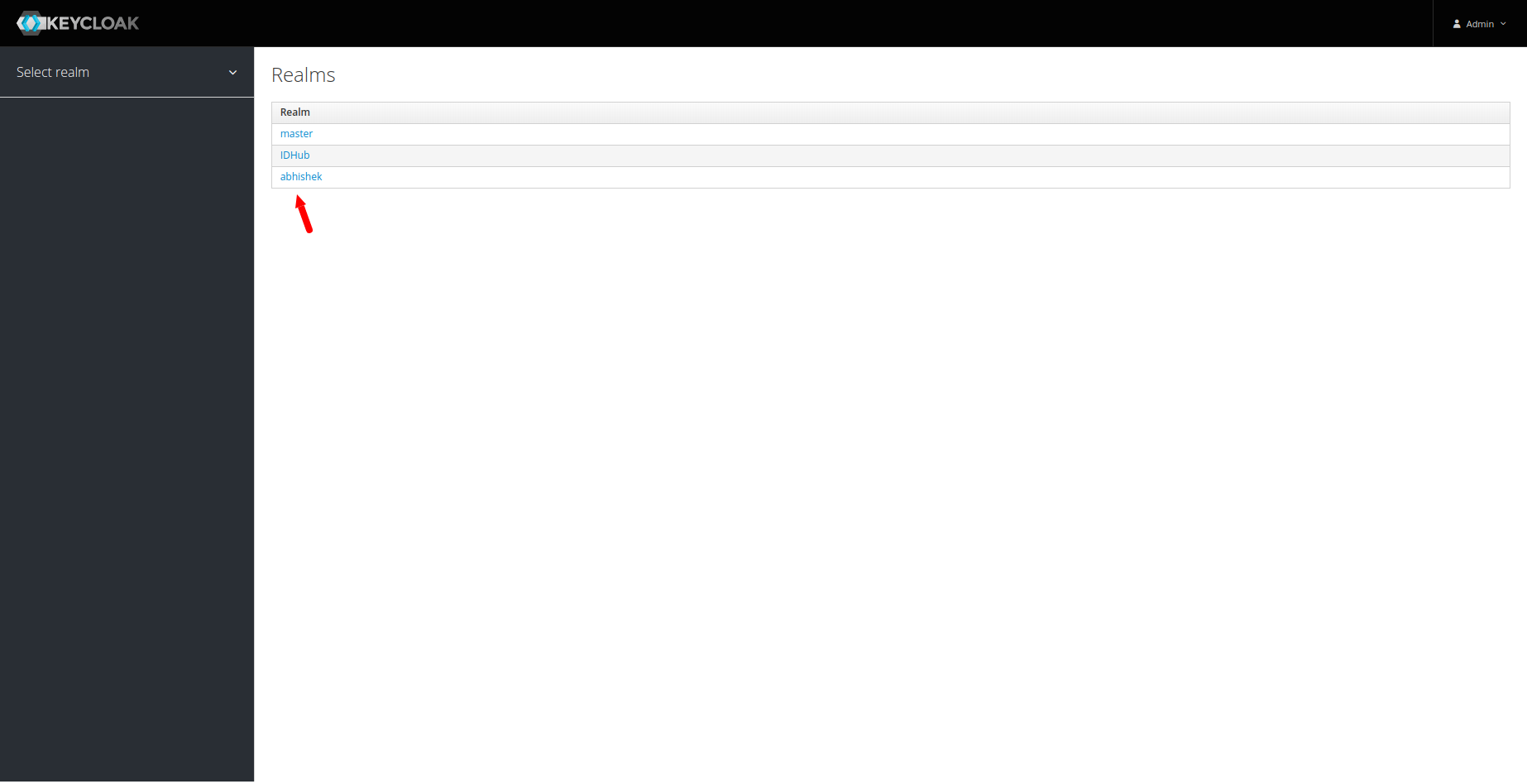 Log into Keycloak Admin console using your Keycloak user name and password and then select your realm.
