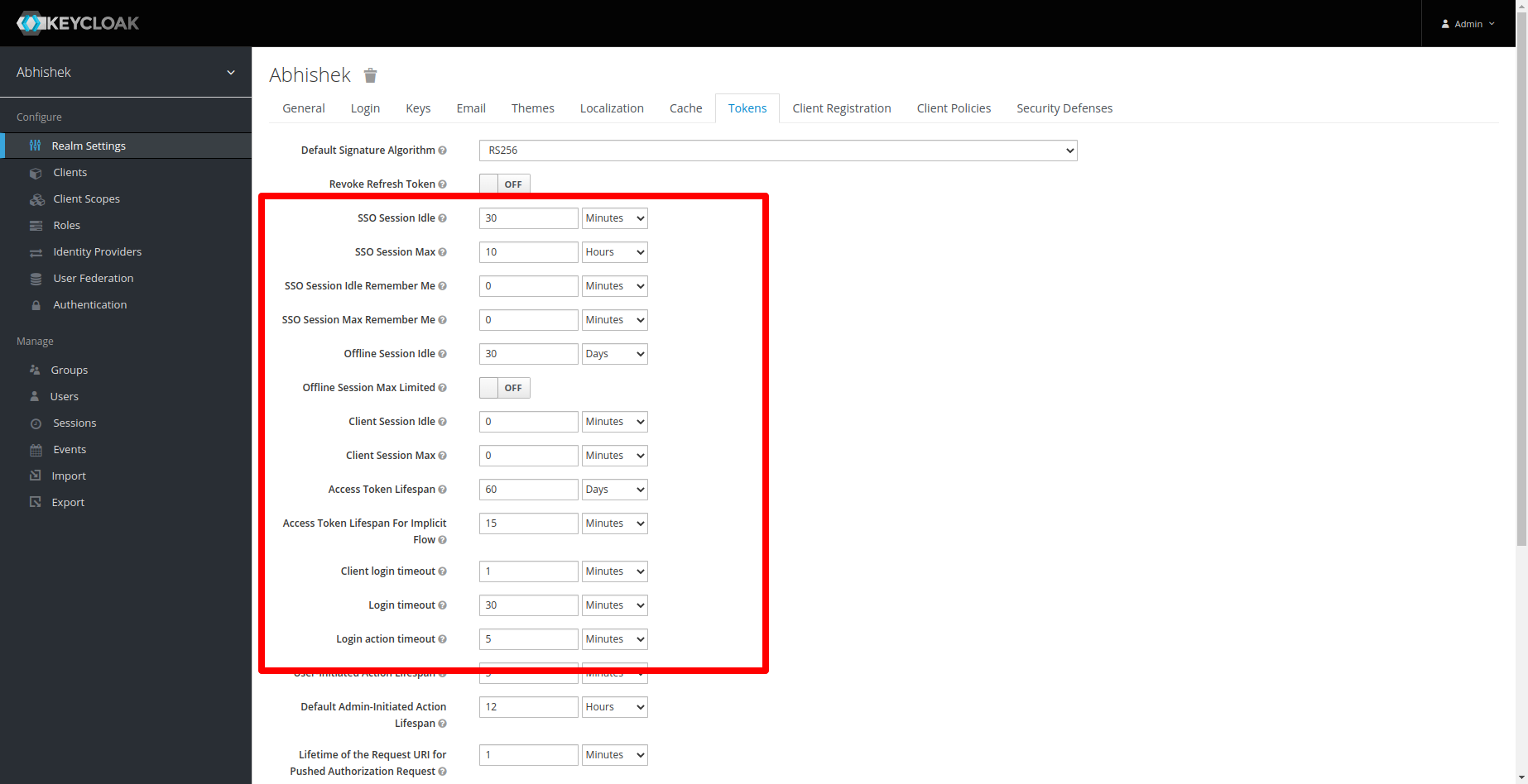 After selecting your realm you will be shown the Realm settings page. After that you need to click on the tokens tab, then you would see the following page: