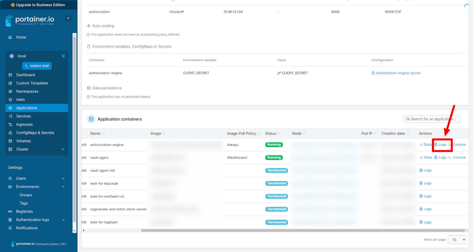 Click on one of the application and then under the application container sections, you will see Pods under that application. You can click on the logs button on one of them to see those logs.