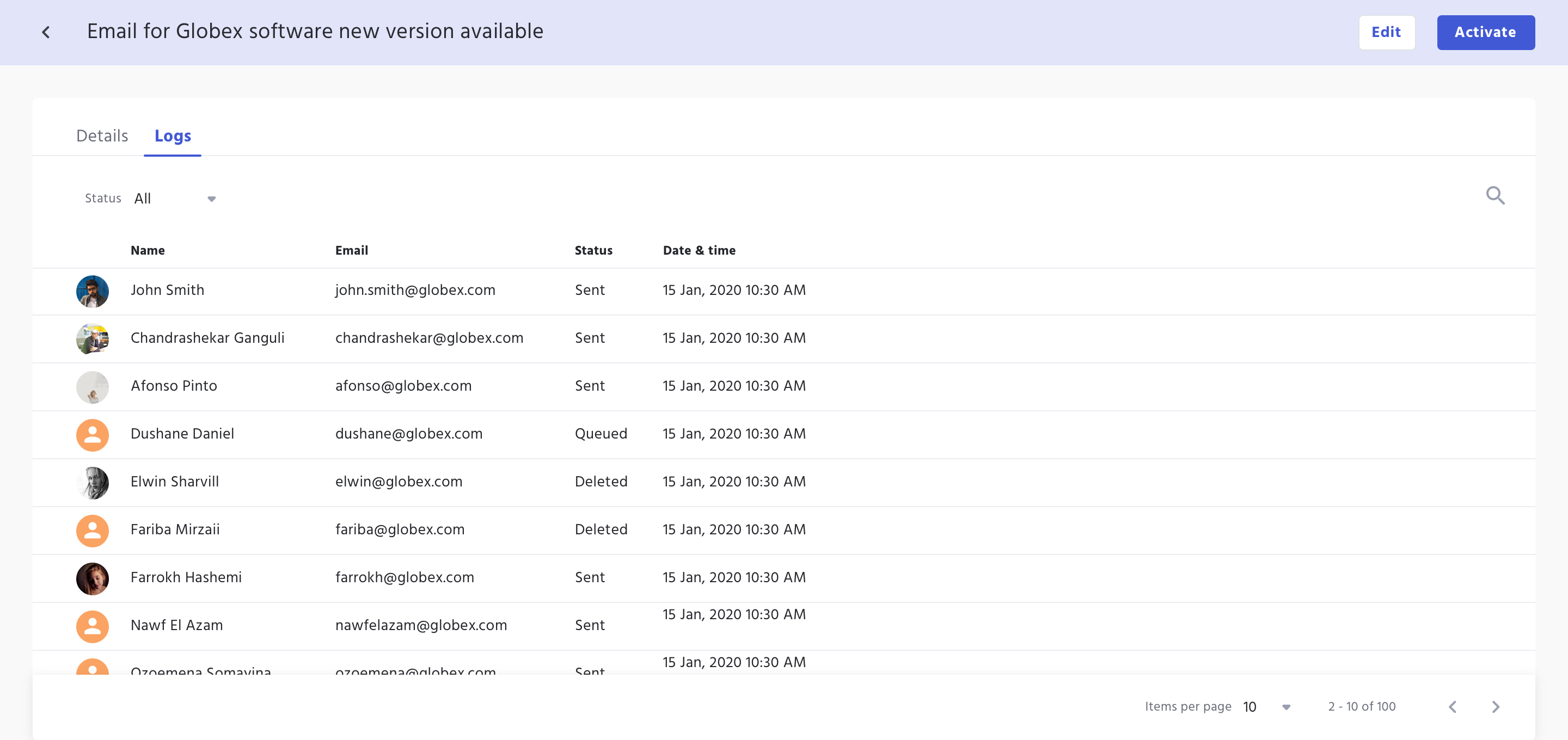 In the Logs tab of the template, you will be able to search for an user based mails sent or email or date or status. The complete list is provided for you to get a preview in case more information is needed.