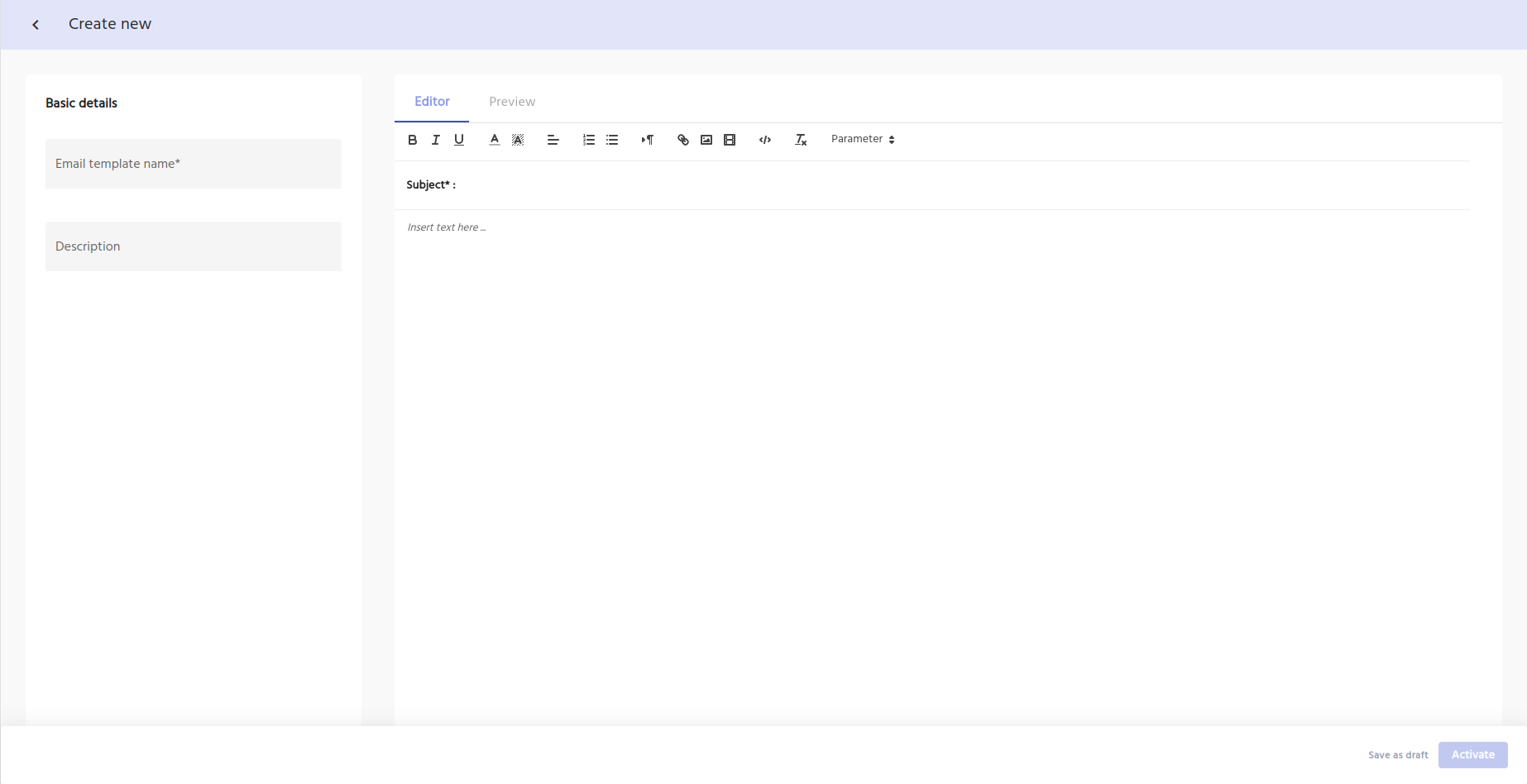 Then in the right hand side of the page, we have provided you the editor where you can enter your content for the email template and the email subject.